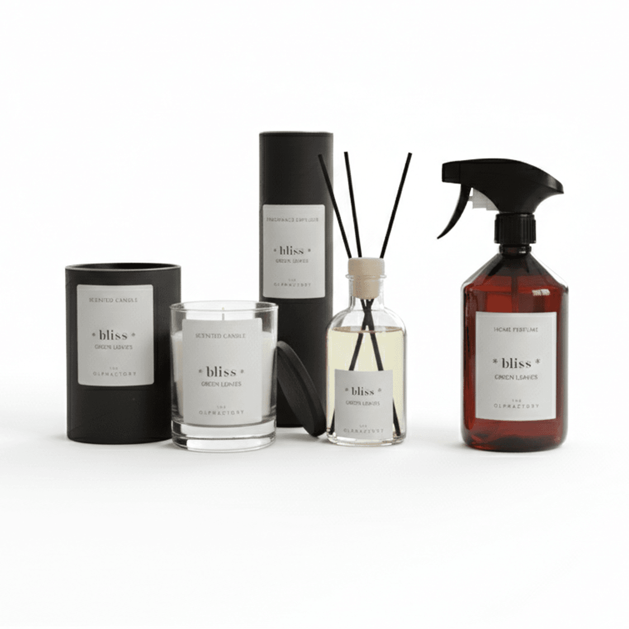 Bliss Green Leaves, The Olphactory, geurstokjes 100ml, interieurspray 500ml, geurkaars 200g, home fragrance set, huisparfum, groene bladtonen, fresh home scent, luxury candle, plant-based wax, room spray, diffuser sticks, ambiance gift, VXhome