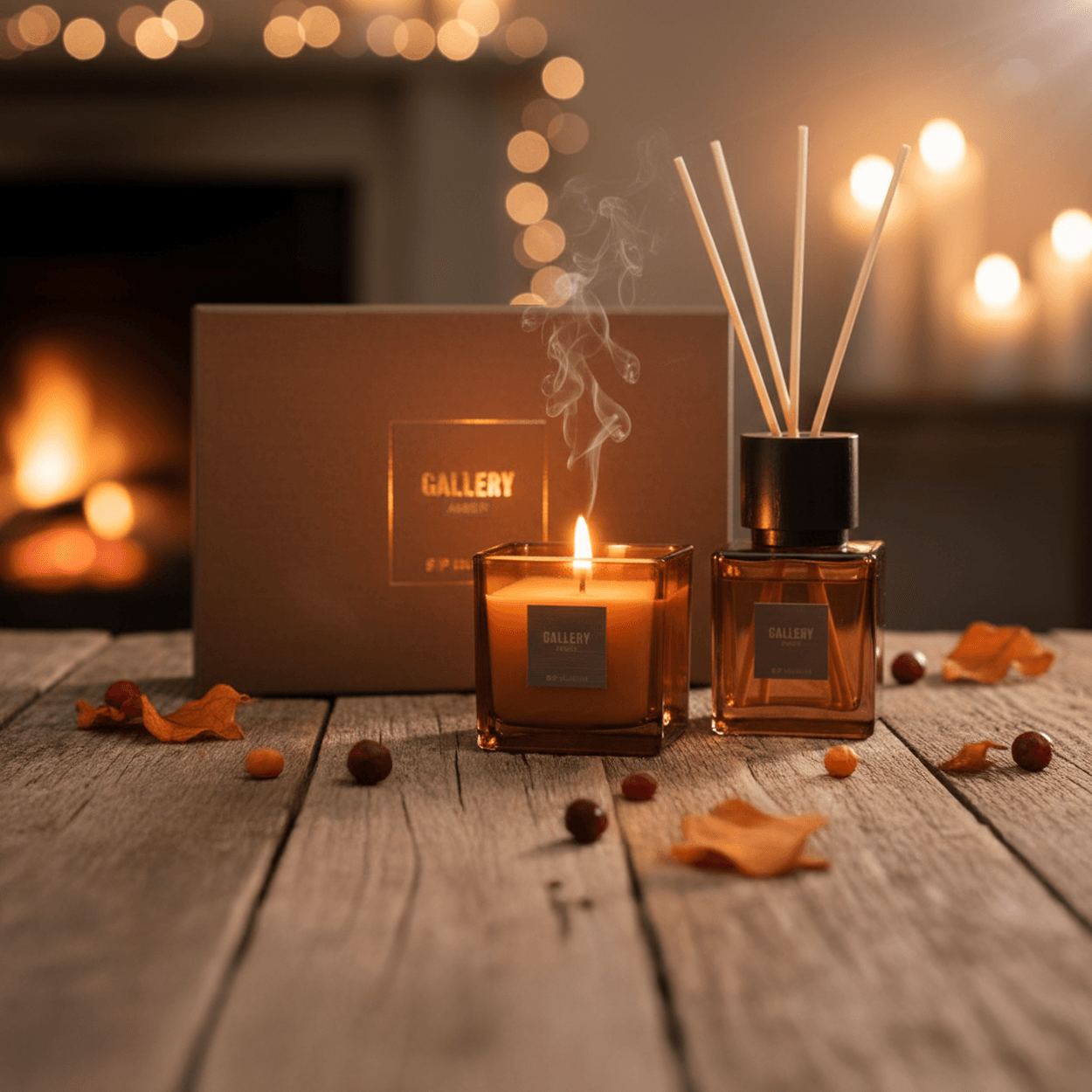 Ambachtelijke geurkaarsen met rijke noten en plantaardige wax voor warme sfeer.